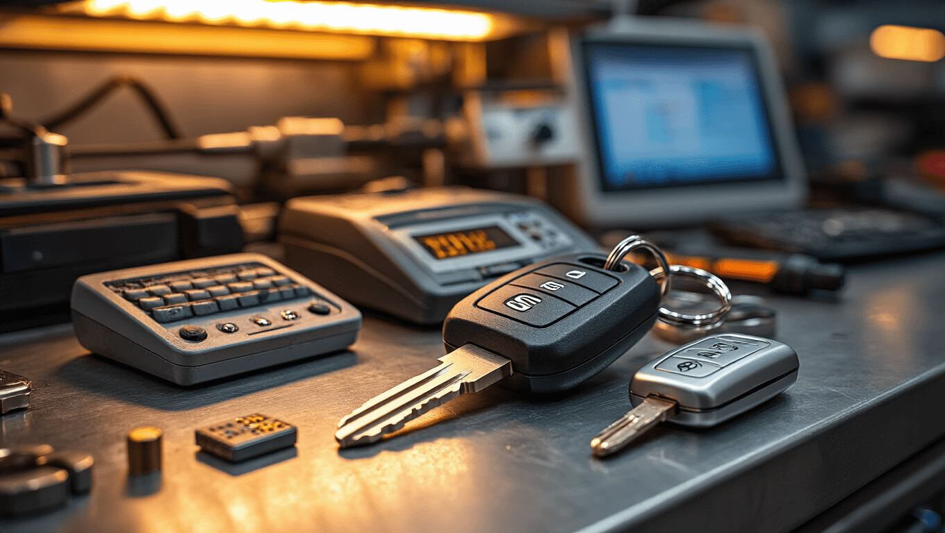 Close-up van een moderne autosleutelwerkplaats met hoogglans metalen werkbanken, precisie-elektronische apparatuur en een goed verlichte werkplek met geordende gereedschappen en transponderprogramma's.